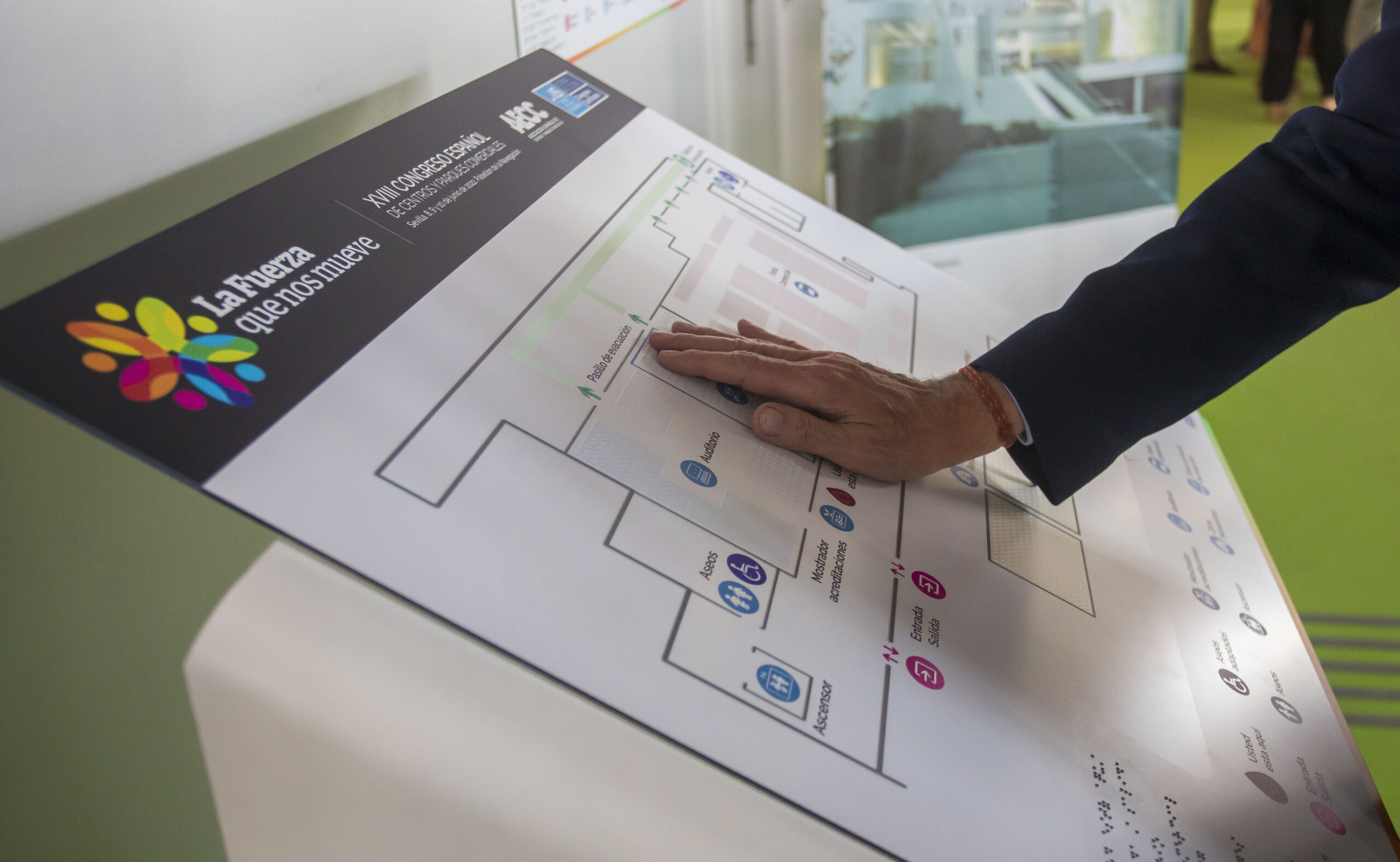 - Señalización suficiente, contrastada, en altorrelieve y braille para permitir la orientación y el entendimiento del espacio. Planos Accesibles con braille y altorrelieve y contraste.
